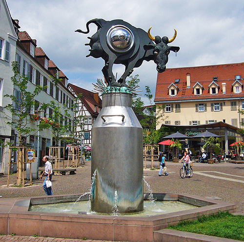Mitten in der Altstadt von Bietigheim steht seit 1987 eine überdimensionierte Milchkanne mit Kuh obendrauf. Das Werk des renommierten Künstlers Jürgen Goertz war zunächst heftig umstritten, war damit in aller Munde und wurde so samt Bietigheim-Billingen (Baden-Württemberg) bekannt und bekannter. Inzwischen hat sicher der Kuhbrunnen fast schon zum Wahrzeichen der Stadt gemausert.